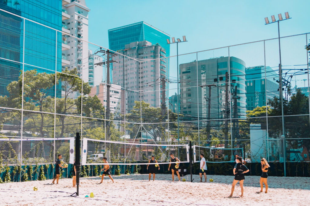 em Belo Horizonte, dentro da Layback Casa Di Praia, o Calçadão BH une esporte na areia, gastronomia e lifestyle, com redes cobertas para jogar em qualquer clima.